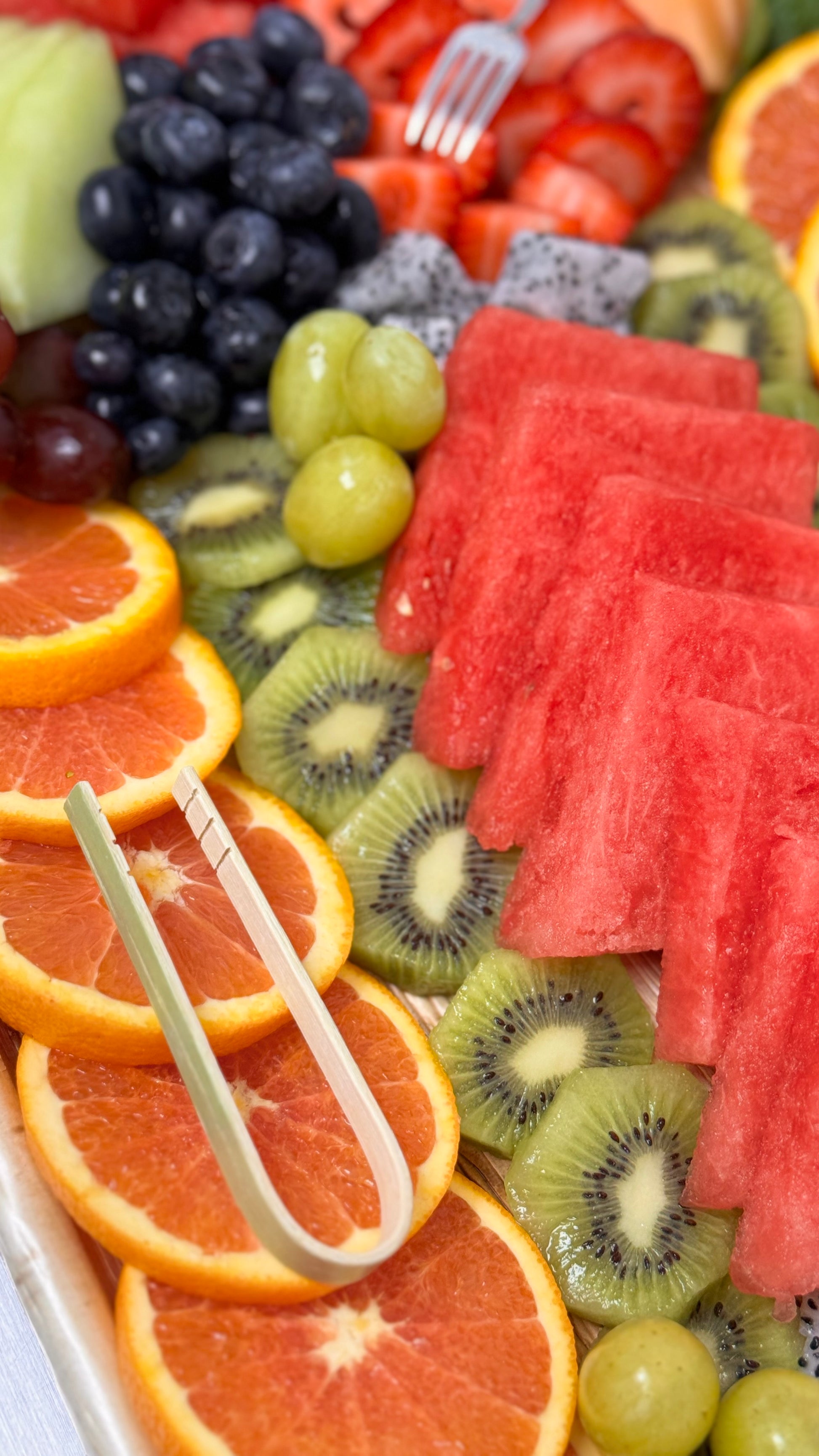 Our board features a variety of fruits such as strawberries, grapes, pineapple, kiwi, oranges and blueberries. It's not only visually appealing but also provides a healthy and refreshing snack option for gatherings or events.